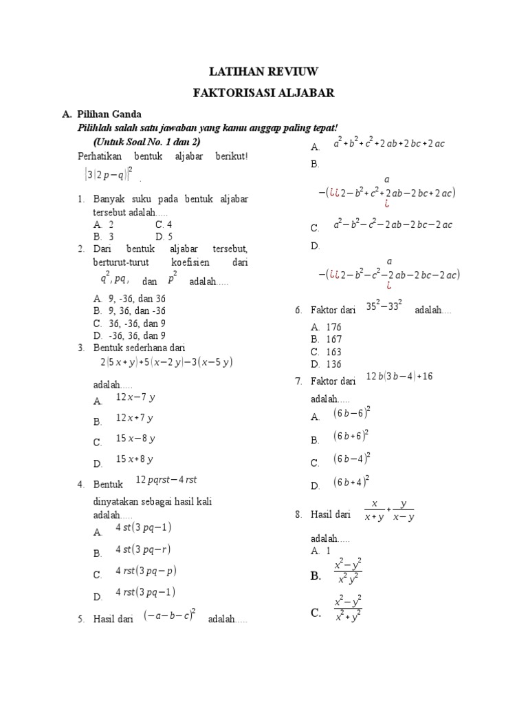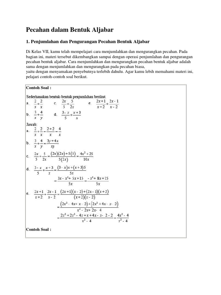 Operasi hitung pada bentuk aljabar. Untuk kasus tertentu, menjumlahkan bentuk aljabar dapat memuat pangkat dan perhitungan yang mutakhir. Untuk anda yang lulus seleksi administrasi, telah cetak kartu ujian serta telah mengetahui lokasi dan jadwal tes. Sedang mencari kumpulan contoh soal dan jawaban tes wawasan kebangsaan untuk latihan cat cpns tahun ini? Contoh penjumlahan dan pengurangan bentuk aljabar. Namun dipertemuan sebelumnya kami telah membahas mengenai contoh soal barisan geometri. Aljabar dapat diartikan sebagai ilmu pasti yang menjabarkan dan juga menguraikan (ukuran/pecahan) supaya menjadi bentuk lain yang bisa dikatakan lebih sederhana. Untuk lebih jelasnya , perhatikan contoh di bawah ini : Untuk menyederhanakan pecahan bentuk aljabar dapat dilakukan dengan cara membagi pembilang dan. Nah, materi makalah pembahasan kali ini mengenai contoh soal aljabar beserta pengertian, sifat, rumus dan pembahasannya. Tips jawab soal cpns hots analogi dan pembahasannya. Alternatif pengganti pimpinan baru untuk pembahasan soal cat cpns pembahasan soal cat cpns. Sederhanakan perkalian pecahan bentuk aljabar berikut.