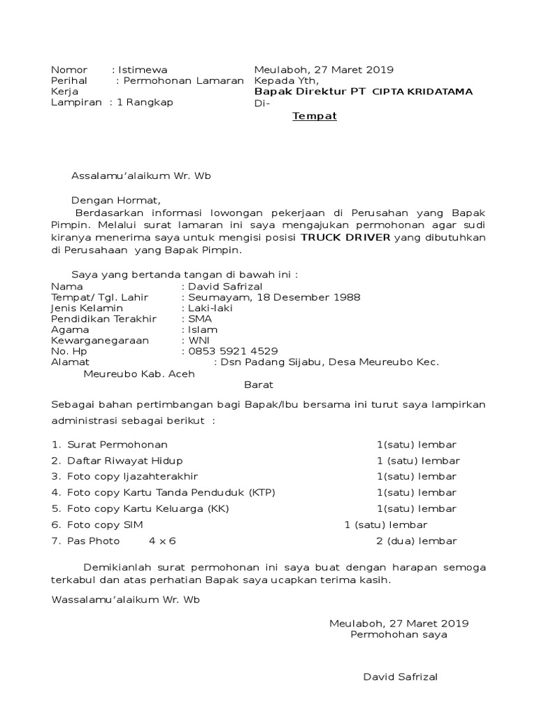 Dengan hormat, berdasarkan informasi yang saya dapat dari koran harian sindo tanggal 12. Sebagai pengetahuan untuk anda, ada beberapa lampiran wajib yang harus anda lampirkan dalam surat lamaran kerja. Dengan demikian, maka untuk anda yang. Surat lamaran merupakan surat permohonan yang dibuat oleh para pelamar pekerjaan atau pencari kerja, kemudian dikirimkan terhadap suatu badan usaha maupun instansi untuk mendapat pekerjaan maupun jabatan berdasarkan lowongan pekerjaan ditawarkan. Dalam lamaran pekerjaan terdapat beberapa lampiran tentang persyaratan yang telah diminta oleh instansi yang.