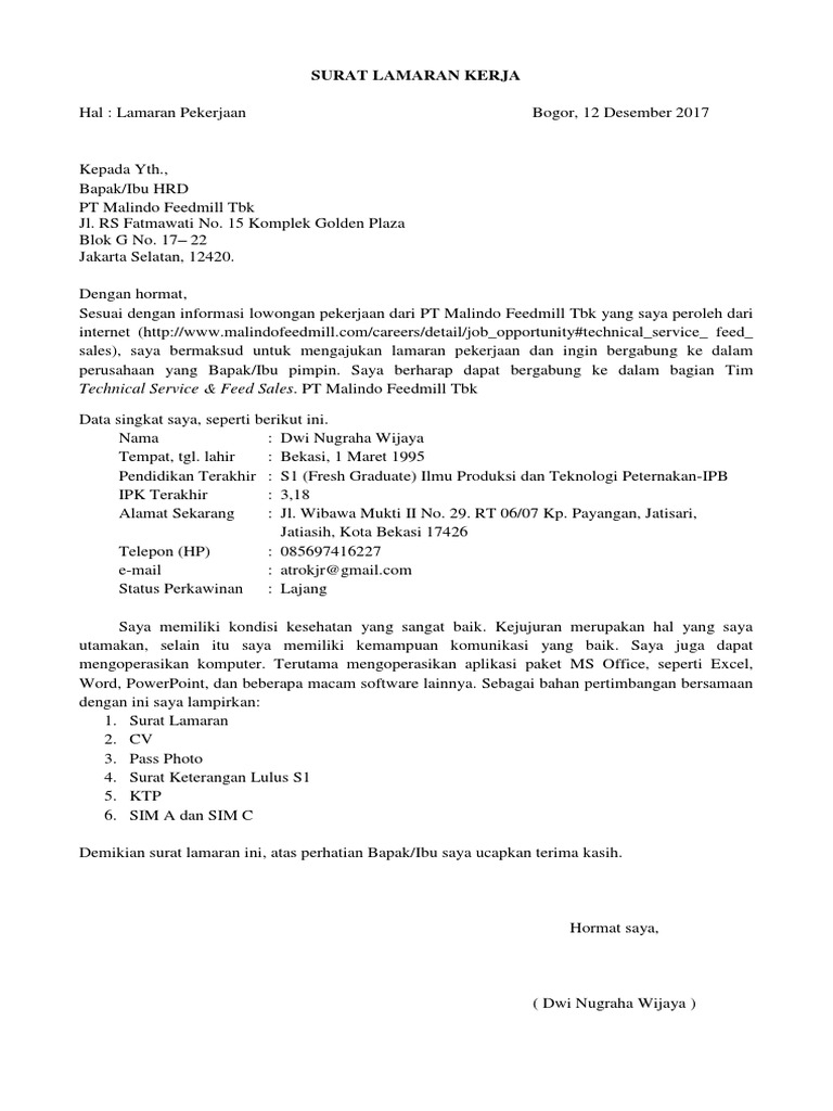 Dengan hormat, sehubungan dengan adanya informasi lowongan kerja di sport station sebagai sales promotion girl, maka dengan ini saya Dulu, surat lamaran kerja memang selalu dikirimkan lewat pos atau diantar langsung ke perusahaan/kantor. Surat lamaran dapat dibuat simple asalkan informasi yang. Contoh surat lamaran ini bisa jadi inspirasi bagi kamu yang ingin melamar kerja. Banyak orang yang menyepelekan akan pentingnya.