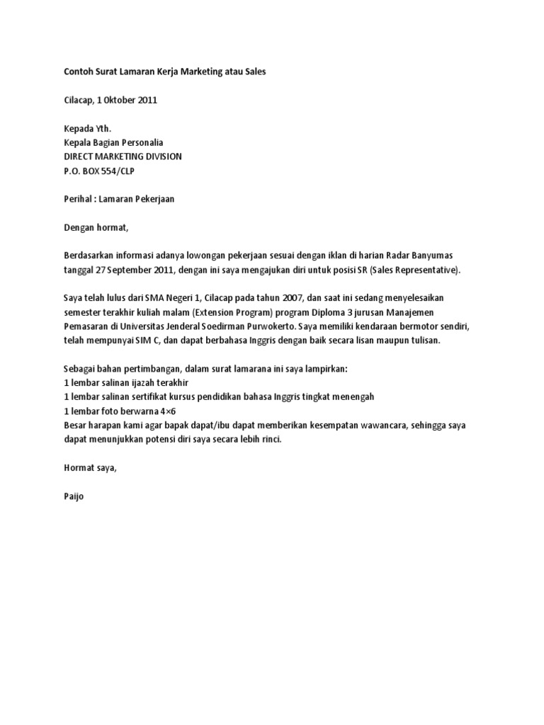Edwin april 10, 2020 contoh surat, tips no comments. Contoh surat lamaran ini bisa jadi inspirasi bagi kamu yang ingin melamar kerja. Dengan hormat, sehubungan dengan adanya informasi lowongan kerja di pt. Contoh surat lamaran kerja lengkap & terbaru 2019 yang baik dan benar / eyd, umum, tulisan tangan, guru, rumah sakit, perusahaan, tulis tangan, pt, pabrik. Surat lamaran merupakan perwakilan pertama pelamar untuk menentukan apakah akan lanjut ke tahap berikutnya atau tidak. Mau apply surat lamaran kerja dimana guys? Penjelasan materi surat lamaran pekerjaan. Tentunya, dengan berbekal pengalaman ataupun fresh graduate kita sebagai manusia akan mengharapkan sebuah pekerjaan yang layak dan tentunya bisa menjamin kehidupan kita. Saat ini, surat lamaran kerja bahasa inggris semakin menjadi keharusan saat melamar ke sebuah perusahaan. Tempat dan tanggal pembuatan surat. Cara mengirim surat lamaran kerja via email. Tepat untuk semua penulisan surat lamaran my experience in sales and customer service, combined with my courses in psychology, has convinced me that hospitaly marketing is career option that. Contoh surat lamaran kerja staff marketing dalam bahasa inggris.