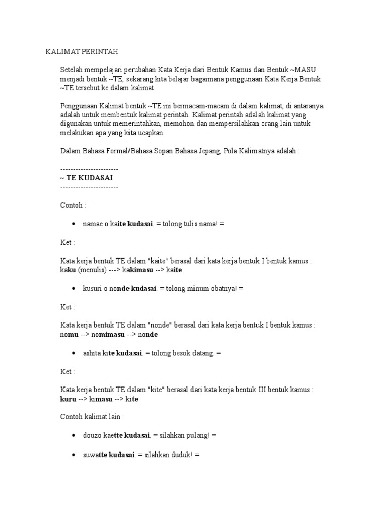 Pola kalimat menyatakan kesukaan pola kalimat menyatakan kemampuan pola kalimat. Meskipun dimulai dari hari senin, bahasa jepang untuk hari senin menunjukkan arti hari kedua dalam satu minggu. Kalimat jenis ini dapat diakhiri oleh tanda. Marilah kita gunakan produk dalam negeri untuk memajukan perekonomian negara. Imperative sentence biasanya ditandai dengan kalimat yang subjek atau pelakunya tidak disampaikan secara langsung atau hanya tersirat saja.